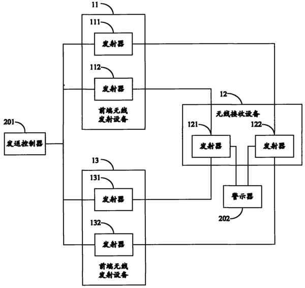 本實用新型實施例公開了無線安防報警系統(tǒng)和裝置。其中,無線安防報警系統(tǒng)包括前端無線發(fā)射設(shè)備和無線接收設(shè)備,前端無線發(fā)射設(shè)備包括多個在發(fā)生警情時發(fā)送報警信號的發(fā)射器,任一發(fā)射器所發(fā)送報警信號的頻率與其他發(fā)射器所發(fā)送報警信號的頻率處于不同頻段;無線接收設(shè)備包括與多個發(fā)射器一一對應(yīng)的多個接收器??梢姡緦嵱眯滦蛯嵤├腥我话l(fā)射器-接收器所工作的頻段與其他發(fā)射器-接收器所工作的頻段均不相同。當(dāng)工作于某個頻段的接收器遭受同頻干擾或鄰頻干擾時,其他頻段的接收器還可與對應(yīng)的發(fā)射器保持正常通訊,從而解決了現(xiàn)有的、只使用單一頻段的無線安防報警系統(tǒng)因受到同頻干擾或鄰頻干擾而導(dǎo)致的漏報警問題。 |