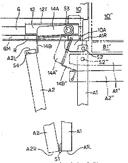 | 25 | 實用新型 | 門的開關(guān)機構(gòu) | 本發(fā)明提供可以把折疊式門打開大于90度角的門的開關(guān)機構(gòu)。柜體(10)形成的開門部位至少有要開關(guān)一部分的相鄰的兩扇門A1、A2,以上下方向的第1軸S1為中心連結(jié)在一起,并可以相互轉(zhuǎn)動,一扇門A1具有以遠(yuǎn)離上述第1軸一側(cè)A1R附近上下方向的第2軸S2為中心與柜體連結(jié),并能相對柜體轉(zhuǎn)動的折疊式門A,以及沿柜體開口部位左右方向移動的移動件12,以上下方向的第3軸S3為中心與上述移動件連結(jié),并能相對上述移動件轉(zhuǎn)動的轉(zhuǎn)動部件14A、14B。上述折疊式門的另一扇門A2以在遠(yuǎn)離上述第1軸一側(cè)A2L附近的第4軸S4為中心,連結(jié)上述轉(zhuǎn)動部件,并可以相互轉(zhuǎn)動。 |