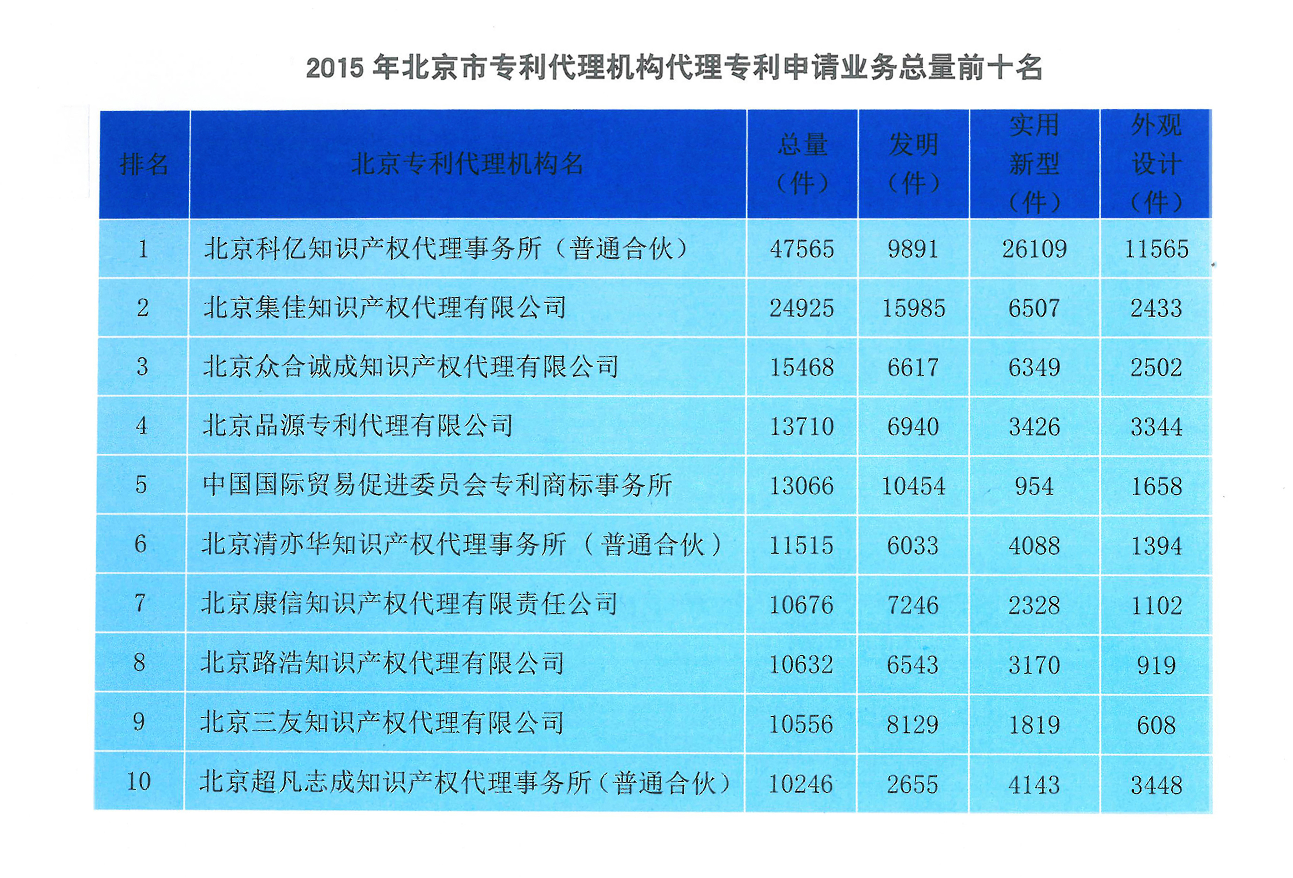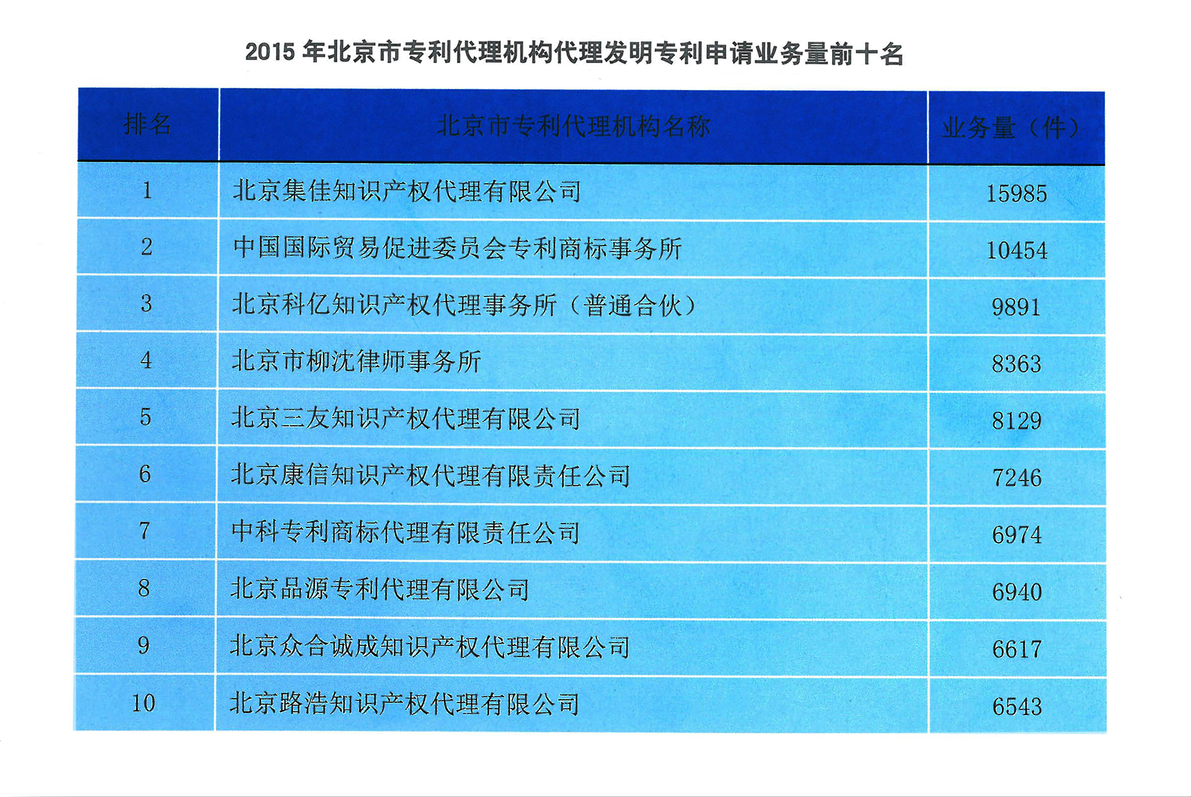 2015北京市專利代理年報發布 集佳代理發明專利申請量再次榮登榜首