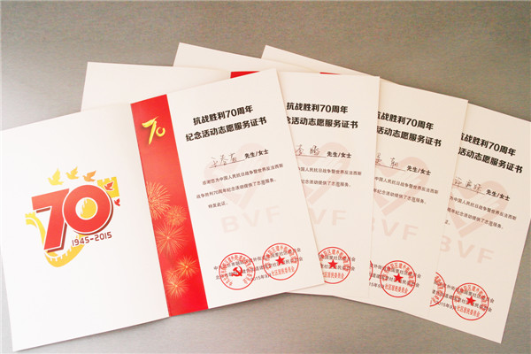 其中,我公司許燕妹、吳朝、李騰、王春菊4位志愿者在長安街執勤引導觀禮群眾的志愿服務活動中,認真負責、無私奉獻、成績顯著,體現出了志愿者嚴謹細致、奉獻求實、拼搏奮斗的優良作風。他們被中共北京市朝陽區建外街道建國里社區委員會和北京市朝陽區建外街道建國里社區居民委員會授予“紀念抗戰勝利七十周年志愿服務先進個人”證書。與此同時,集佳也被授予“紀念抗戰勝利七十周年志愿服務先進單位”稱號。