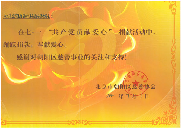 2014年是中國共產黨成立93周年,是全面貫徹黨的十八屆三中全會精神、深入開展黨的群眾路線教育實踐活動的重要一年。為充分發揮共產黨員的先鋒模范作用,集佳律師事務所積極響應朝陽區律協黨委開展“共產黨員獻愛心”捐款活動的號召,面向全所黨員律師、入黨積極分子組織愛心捐獻活動。