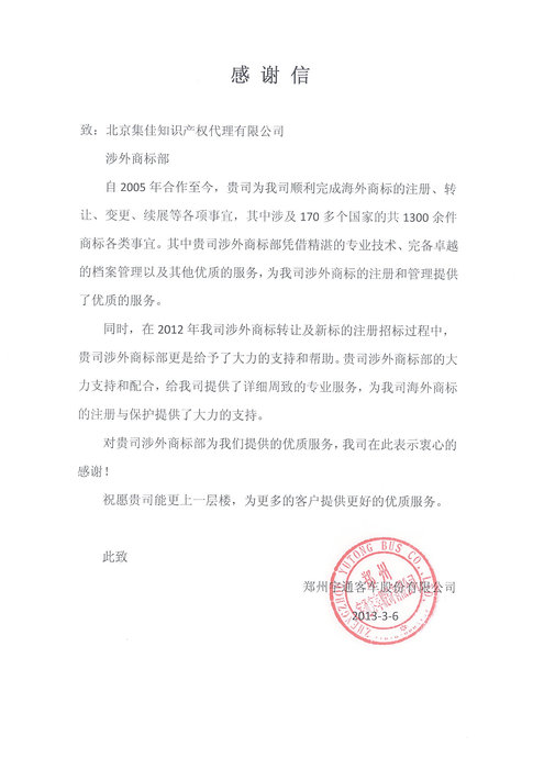 3月6日,鄭州宇通客車股份有限公司向集佳發來感謝信。合作的8年來,集佳為宇通涉外商標注冊、轉讓、變更、續展等提供了優質服務,宇通在集佳的幫助和支持下成功完成了2012年涉外商標轉讓及新標注冊的招投標項目。