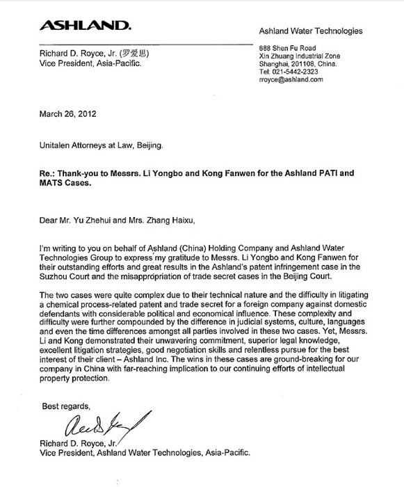 2012年年初,集佳律師事務(wù)所李永波律師和孔繁文律師代理的美國亞什蘭公司擁有的“水包水型聚合物分散體的制造方法及其產(chǎn)品” 專利及商業(yè)秘密維權(quán)案件獲得全面勝利。近日,集佳收到由亞什蘭亞太區(qū)副總裁Richard D.Royce,Jr簽署的感謝信,感謝集佳一直以來對于本案的不懈努力,并對代理本案的李永波律師和孔繁文律師的辛勤付出表示感謝,對集佳全心全意為客戶服務(wù)的工作態(tài)度表示肯定。