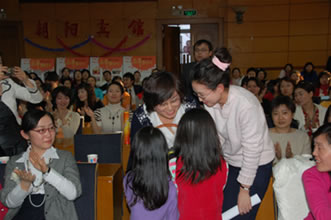 兩個(gè)可愛(ài)的小朋友獻(xiàn)花給米春梅阿姨表示祝福和感謝
