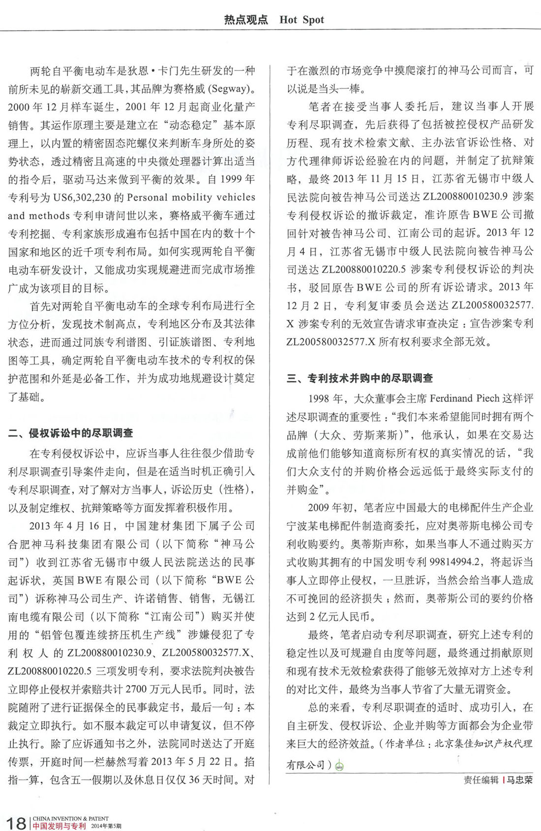 集佳律師撰文《創新性企業專利盡職調查操作實務》被《中國發明與專利》發表