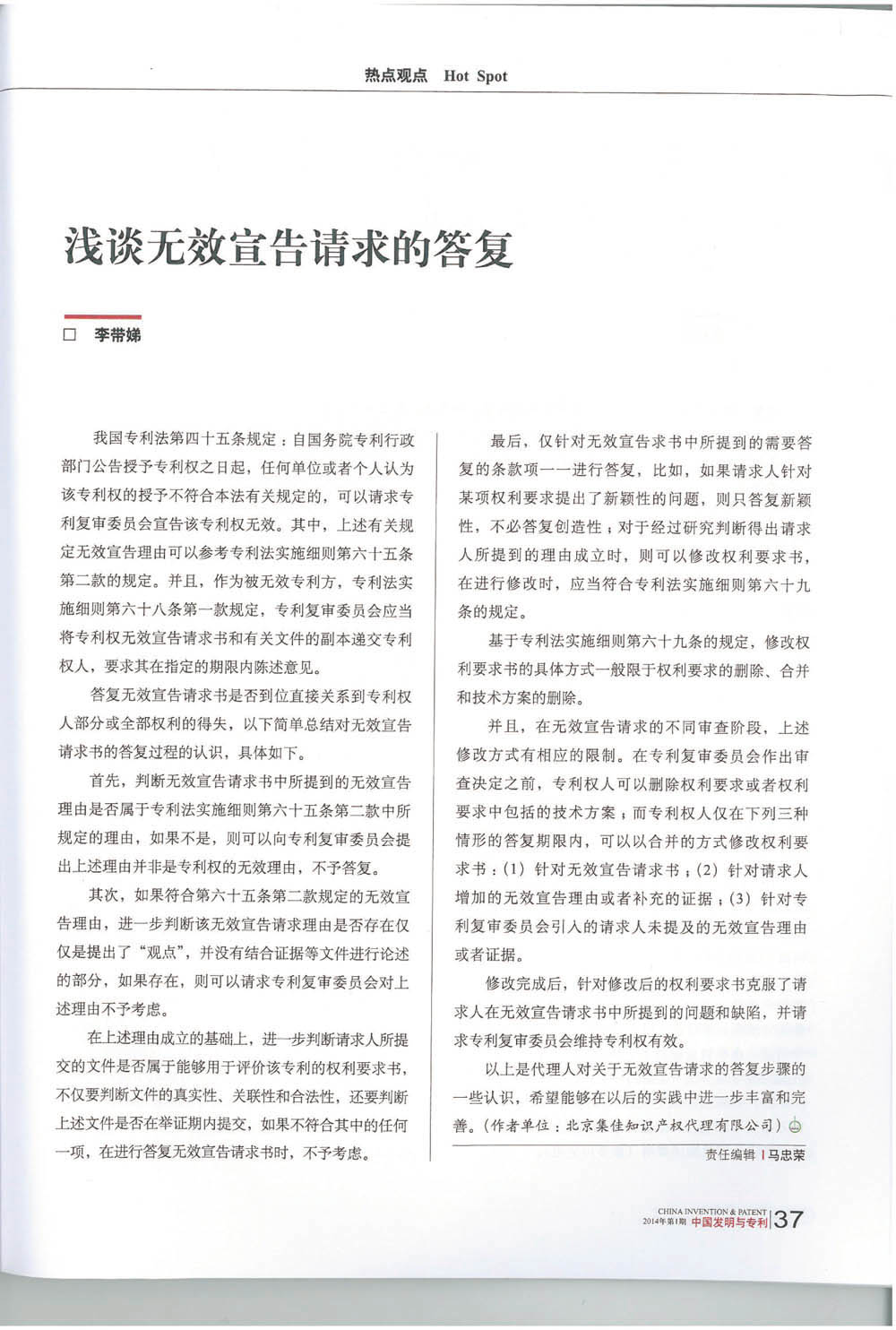 集佳代理人文章《淺談無效宣告請求的答復》在《中國發明與專利》發表