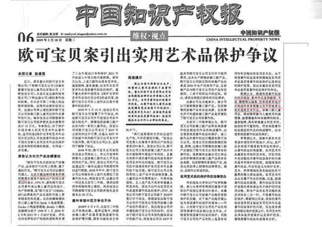《中國知識產(chǎn)權(quán)報》:歐可寶貝案引出實用藝術(shù)品保護(hù)爭議