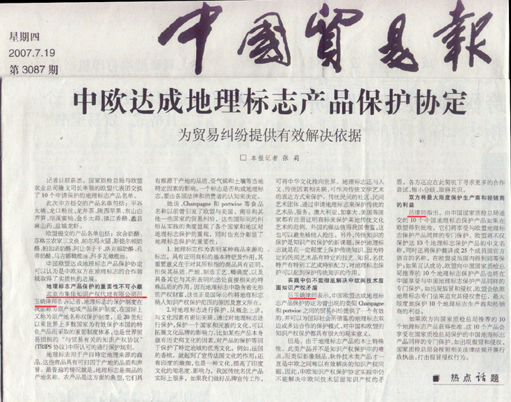 原文:《中歐達(dá)成地理標(biāo)志產(chǎn)品保護(hù)協(xié)定 為貿(mào)易糾紛提供有效解決依據(jù) 》