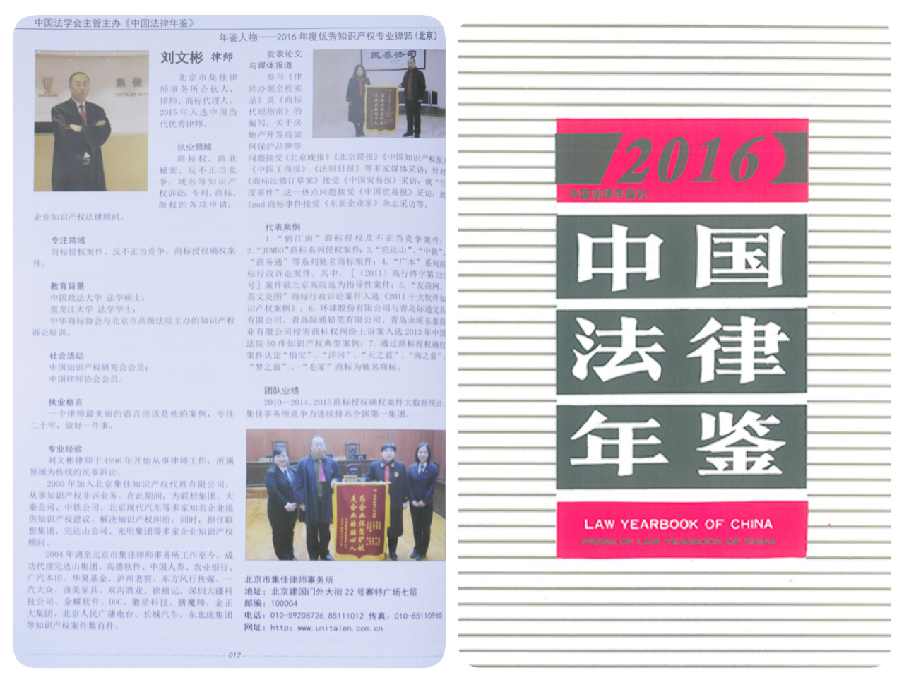 日前,由中國法學會主辦的《2016中國法律年鑒》正式出版發(fā)行,集佳律師事務(wù)所合伙人劉文彬律師入選“年鑒人物——2016年度優(yōu)秀知識產(chǎn)權(quán)專業(yè)律師”。