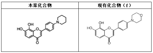 案例1:該案涉及作為TrkB激動劑的二羥基黃酮類化合物,該案最主要的化合物和最接近的現有化合物的結構式如下,兩者具有相同的母核苯基二羥基黃酮、用途類似,區別僅在于本案的苯基上的取代基為哌啶基而現有化合物f為嗎啉基。