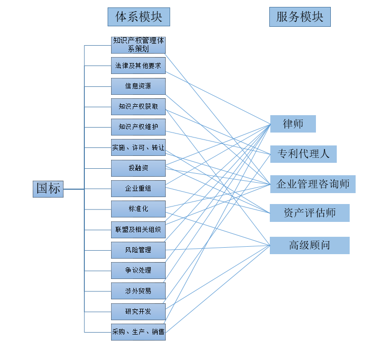 第一種鑒于其特殊情況,雖然市場(chǎng)占比較高,本文不做討論,而第二種情況,企業(yè)和咨詢機(jī)構(gòu)在構(gòu)建體系過(guò)程中,人力和物力量投入最大的三個(gè)模塊分別是管理現(xiàn)狀診斷、構(gòu)建知識(shí)產(chǎn)權(quán)管理體系、培訓(xùn)和運(yùn)行,涉及到的服務(wù)人員有咨詢師、律師、專利代理人、資產(chǎn)評(píng)估師。而培訓(xùn)和運(yùn)行模塊中的培訓(xùn)模塊,包括管理培訓(xùn)子模塊9個(gè)課時(shí),知識(shí)產(chǎn)權(quán)基礎(chǔ)子模塊3個(gè)課時(shí),專利維護(hù)子模塊1個(gè)課時(shí)、專利撰寫子模塊2個(gè)課時(shí),專利保護(hù)和信息利用子模塊3個(gè)課時(shí),知識(shí)產(chǎn)權(quán)運(yùn)營(yíng)子模塊1個(gè)課時(shí),知識(shí)產(chǎn)權(quán)保密管理子模塊1個(gè)課時(shí),知識(shí)產(chǎn)權(quán)風(fēng)險(xiǎn)規(guī)避子模塊1個(gè)課時(shí)。