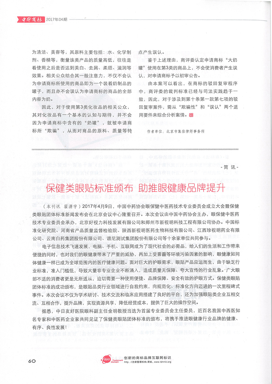 集佳文章《以“大奶罐”駁回復審案談商標法第十條第一款第七項的適用》在《中華商標》發表