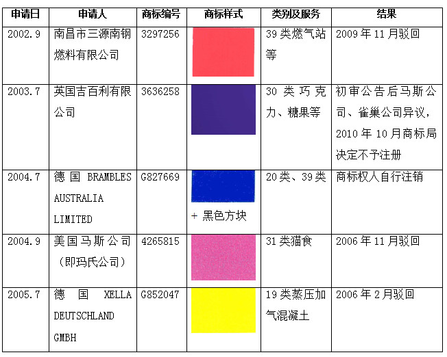 我國(guó)現(xiàn)有的商標(biāo)法將單一顏色排除在被列舉的可予注冊(cè)標(biāo)志的范圍之外。作為成文法國(guó)家,由于沒(méi)有明確的法律授權(quán),商標(biāo)審查機(jī)關(guān)在實(shí)踐中實(shí)際上排除了單一顏色作為商標(biāo)注冊(cè)的可能性。我國(guó)擁有世界上第二大商標(biāo)注冊(cè)簿,但至今尚無(wú)一例單一顏色申請(qǐng)獲準(zhǔn)注冊(cè)。如下圖所示,自2002年起就至少有5件單一顏色商標(biāo)注冊(cè)申請(qǐng),首次提出單一顏色申請(qǐng)的并非外國(guó)企業(yè)而是江西南昌某石油化工企業(yè);但除了英國(guó)吉百利有限公司的注冊(cè)申請(qǐng)?jiān)怀鯇徆妗⒌S后由于他人異議決定不予注冊(cè)之外,對(duì)于其他單一顏色的注冊(cè)申請(qǐng),商標(biāo)局均是直接予以駁回。