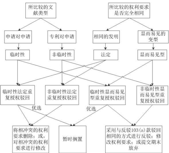重復(fù)授權(quán)按照所比較的文獻(xiàn)類型分為臨時(shí)性重復(fù)授權(quán)和非臨時(shí)性重復(fù)授權(quán)。重復(fù)授權(quán)按照所比較的權(quán)利要求是否完全相同分為法定重復(fù)授權(quán)和非法定重復(fù)授權(quán)。