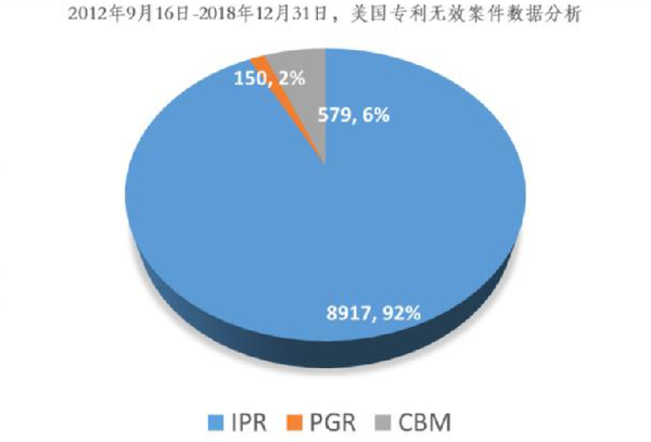 5、根據USPTO(美國專利商標局)公布的2012年9月16日至2018年12月31日美國專利無效案件數據,在IPR、PGR、CBMR三種無效(復議)程序中,IPR占比最多,高達92%,合計為8917件;IPR較少,占比僅為2%,合計150件。從目前的數據觀察,IPR是上述三種無效(復議)程序中最受歡迎的方式。