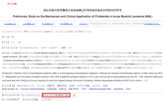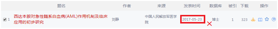 CNKI網頁顯示的“發表時間”并非該論文的公開日。實際上,CNKI只是將論文首頁記載的日期(答辯日期)登記為“發表時間”,并錄入數據庫中,但并不對此進行核實。論文首頁記載的答辯日期類似于送審日期(或收稿日期)。任何一篇文章或論文在網絡刊物或期刊雜志上公開發表之前,都會送審,因而都有一個送審版本,該送審版本可能是電子版或紙本,該送審版本都需要發送或遞交給網絡刊物或期刊雜志聘請的專家進行審稿,審稿通過后才能公開發表。許多網絡刊物或期刊雜志都會在發表的文章中記載送審日期或收稿日期。這些送審日期與發行日期是不同的日期。例如,“DCAG聯合HLA不相合的干細胞輸注治療老年初發急性髓系白血病的療效觀察”這篇論文的送審日期是2014年4月9日,但是其發行日期是2015年3月。因此,通常送審日期要早于發行日期。