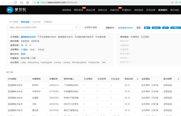 為此,筆者在摩知輪以“肽”為關鍵字檢索2020年包含“肽”的商標駁回復審決定書,檢索結果顯示,截止2020年12月3日,共計出現包含“肽”的商標駁回復審決定書82件,其中80件予以駁回,僅2件通過行政訴訟予以初步審定并公告。在82份駁回復審決定中,71件以《商標法》第十條第一款第(七)項“帶有欺騙性,容易使公眾對商品的質量等特點或者產地產生誤認的”條款駁回。