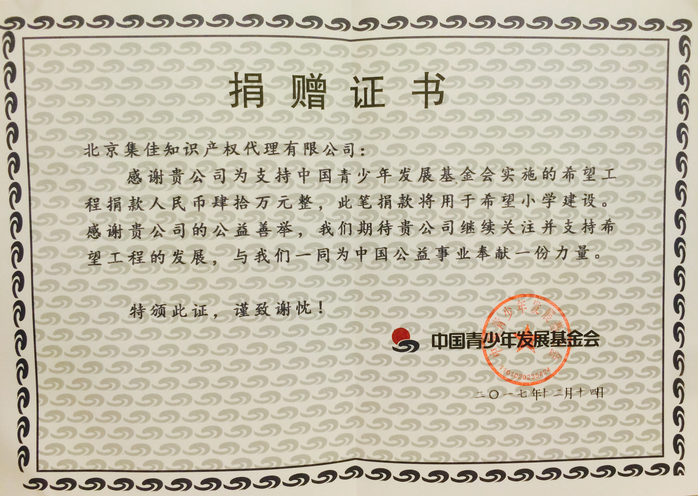 雙旦來臨之際,集佳也迎來了一個好消息。中國青少年發(fā)展基金會再一次將援建希望小學(xué)的捐贈證書頒給集佳,表示對集佳十幾年如一日踐行“一年建一所集佳希望小學(xué)”承諾的感謝。自2006年以來,為了支持中國青少年發(fā)展基金會實施“希望工程”,集佳每年都會投入專門款項,用于希望小學(xué)建設(shè)。
