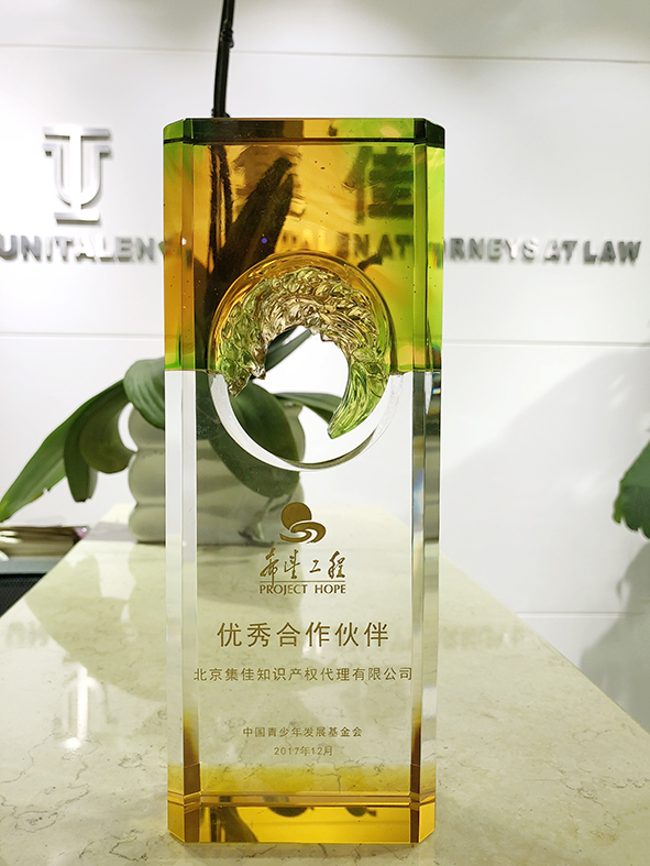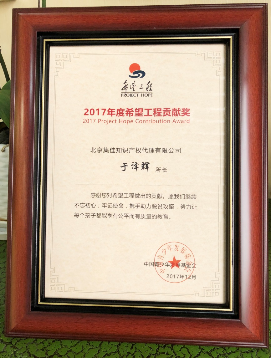 近日,集佳收到了中國青少年發展基金會頒發的“希望工程優秀合作伙伴”獎與“2017年度希望工程貢獻獎”,特別表彰于澤輝所長帶領集佳對希望工程作出的支持與貢獻。此外,青基會在《中國青年報》刊發整版感謝函,對包括集佳在內的100多家單位和企業衷心致謝。