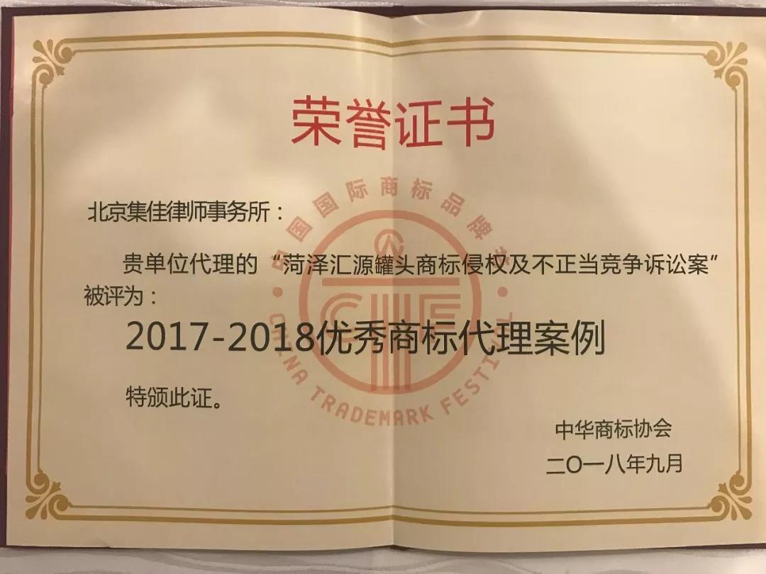 2018中國國際商標品牌節(jié)進行到第二日,又一令人期待的獎項頒布了。中華商標協會梳理和回顧了過去一年商標領域發(fā)生的重大典型事件、案件,從參加申報的眾多商標代理案例中評選出了26件年度商標典型案例,以此樹立優(yōu)秀案例標桿,發(fā)揮示范指導效應。集佳律師事務所代理的“菏澤匯源罐頭商標侵權及不正當競爭訴訟案”成功入選“2017-2018優(yōu)秀商標代理案例”。