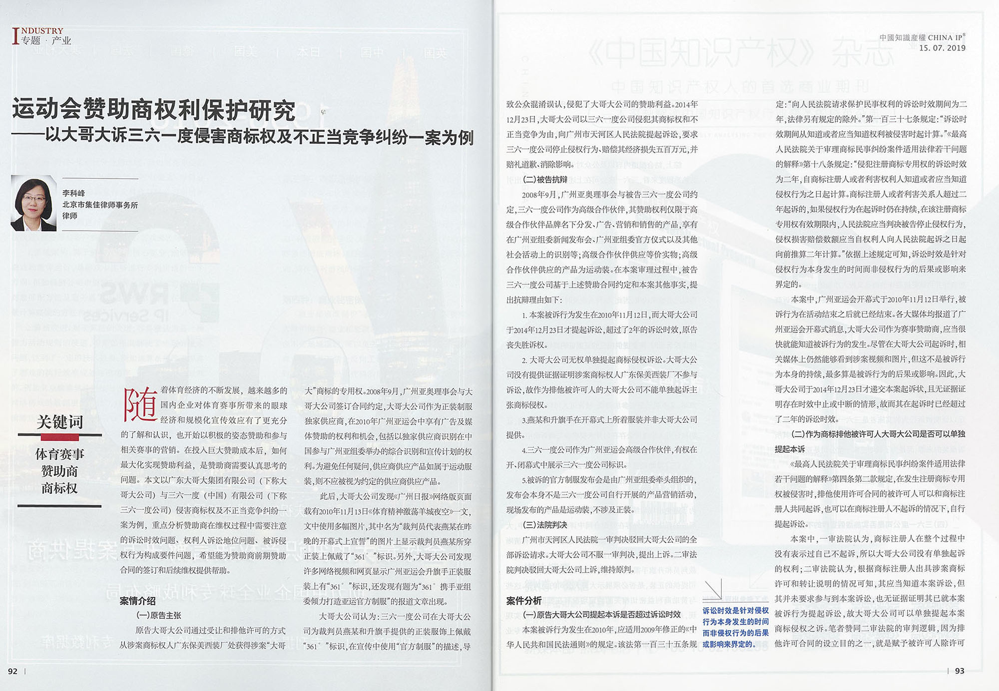 集佳文章《運動會贊助商權利保護研究——以大哥大訴三六一度侵害商標權及不正當競爭糾紛一案為例》在《中國知識產權》 發表