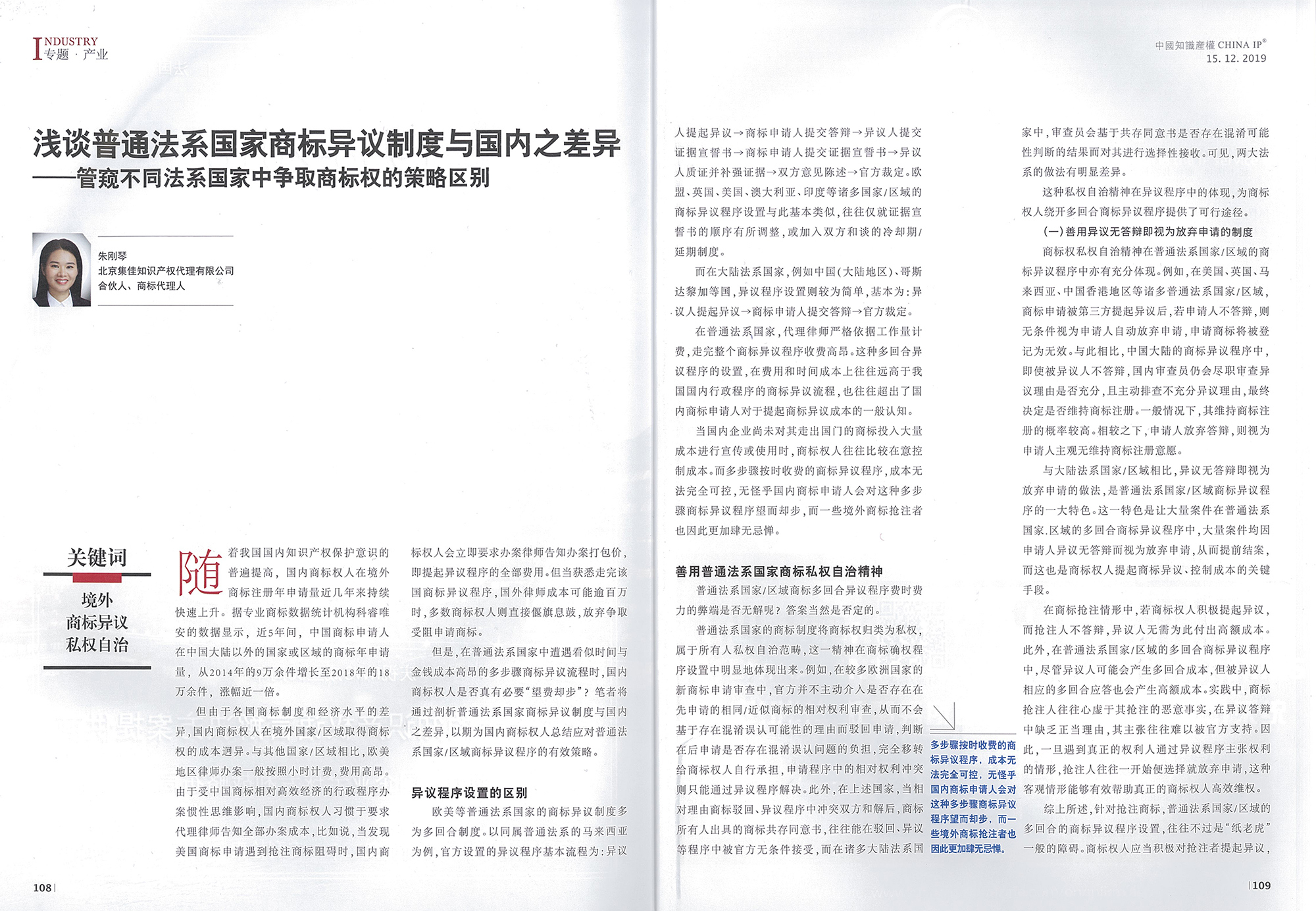 集佳文章《淺談普通法系國家商標異議制度與國內(nèi)之差異——管窺不同法系國家中爭取商標權(quán)的策略區(qū)別》在《中國知識產(chǎn)權(quán)》發(fā)表