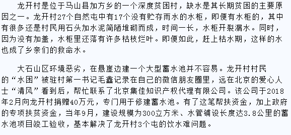 據(jù)了解,龍開村是目前南寧市僅剩的10個因脫貧指標未達標而沒脫貧摘帽的深度貧困村之一。該村山多地薄水少,由于季節(jié)性缺水,飲水困難、飲水衛(wèi)生的問題成為影響當?shù)卮迕窕旧畹淖钔怀鰡栴},并深刻制約了當?shù)氐慕?jīng)濟發(fā)展。2018年,北京集佳知識產(chǎn)權(quán)有限公司了解到這一情況之后,積極幫助龍開村出主意想辦法,并捐贈40萬元,在龍開村仲團屯修建了蓄水池工程,徹底解決了多年來長期困擾三個屯村民的飲水難問題,并改善了農(nóng)業(yè)生產(chǎn)條件,為當?shù)卮迕窆悦撠毺峁┝诵判暮拖M?019年5月13日,龍開村黨支部第一書記毛鑫等一行4人代表村民為集佳贈送“愛心傾注龍開蓄水池,精準扶貧深度貧困村”錦旗,表達了龍開村民的真誠謝意。