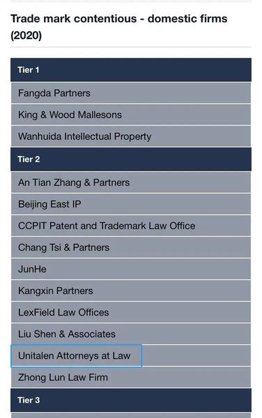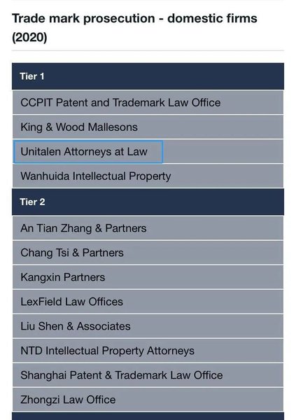 近日,全球領先的權威知識產權媒體《知識產權管理》(Managing Intellectual Property,MIP)公布了2020年商標業務的知識產權之星排行榜,集佳再次蟬聯商標申請及確權領域(Trademark Prosecution)排行榜第一梯隊,并榮登商標保護及訴訟領域(Trademark Contentious)排行榜第二梯隊。