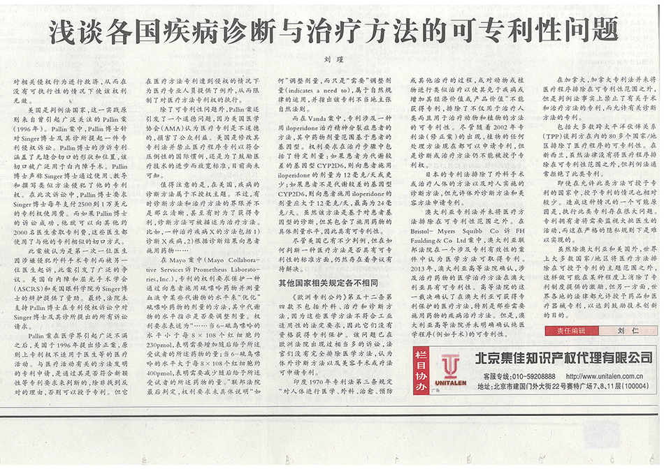集佳文章《各國疾病診斷與治療方法的可專利性問題》在《中國知識產(chǎn)權(quán)報》發(fā)表