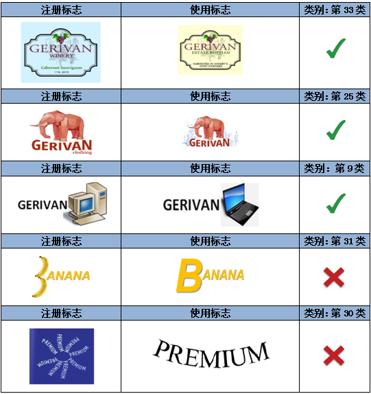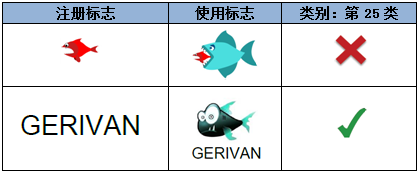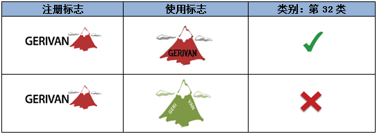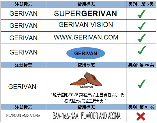 如上述示例,注冊商標指定在第32類礦泉水商品上,相較而言,圖形對指定商品具有一定暗示性,而顯著性較弱。因此,文字部分“GERIVAN”為該注冊商標的主要顯著部分。第一組中的使用標志僅是對圖形和文字的位置進行了調(diào)整,不影響文字部分的顯著性。而第二組的使用標志對文字進行了拆分,形成了新的商業(yè)印象,故視為實質(zhì)變更。