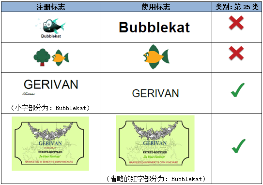 若注冊標識本身具有中等強度的顯著性,在此基礎(chǔ)上省略的為非顯著要素或弱顯著要素,則一般視為注冊標識的使用。但若省略的部分為主要視覺部分,或與注冊標志中其他元素有相互作用的關(guān)聯(lián)關(guān)系,則其省略可能會造成顯著部分的實質(zhì)變更。如: