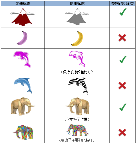 對于純圖形商標而言,顯著性來源于特定形式中的圖形要素。因此,對圖形的更改很可能會改變注冊標志的主要顯著特征,除非它涉及的并非對標志顯著性至關(guān)重要的特征(例如顏色,形狀等)。但若顏色系構(gòu)成顯著特征的來源(如以下示例七第二組),則顏色的改變也將視為注冊商標的實質(zhì)變更。如果純圖形商標的顯著性很低,則即使對商標進行很小的改動也可能導(dǎo)致其顯著性的實質(zhì)改變。