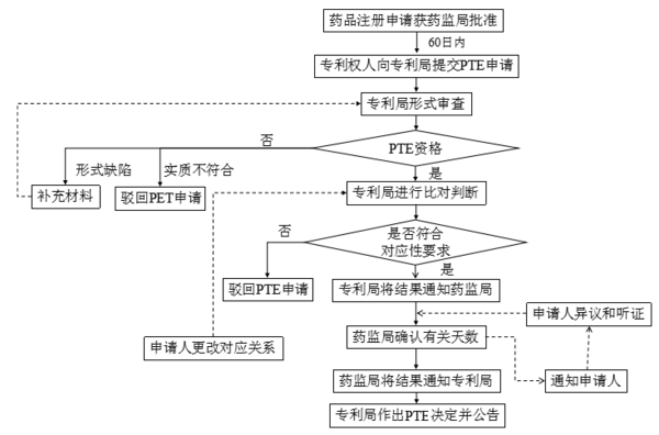 3)藥監(jiān)局將相關(guān)的申報(bào)審批資料共享給專利局,專利局完成比對(duì)分析和判斷,不符合對(duì)應(yīng)性要求的,專利局做出拒絕給予PTE的審查結(jié)論,程序終止;符合對(duì)應(yīng)性要求的,專利局將結(jié)果通知藥監(jiān)局;