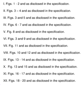 通過列出的權(quán)利要求與附圖的對應(yīng)關(guān)系表格,即可以清楚地確定不同的子類對應(yīng)的權(quán)利要求。例如,申請人選擇了 Species XII,其對應(yīng)權(quán)利要求有1,2,3,5…。在這種情況下,建議選擇的同時一并進行反駁,從而在所選擇的權(quán)利要求授權(quán)之后,也可以重新加入其他未選擇的無沖突的權(quán)利要求。