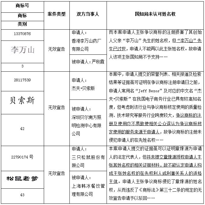 然而,在下述無效案件中,國知局并未對姓名權予以認可,請見如下表格: