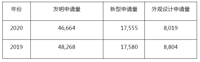 根據(jù)公布情況來看,中國臺灣智慧財產(chǎn)局2020年共受理72,238件發(fā)明專利申請,比2019年減少3.2%;其中受理發(fā)明專利申請46,664件,比2019年減少3.3%;受理新型專利申請17,555件,與2019年持平;受理外觀設(shè)計專利申請8,019件,比2019年減少8.9%。具體見下表: