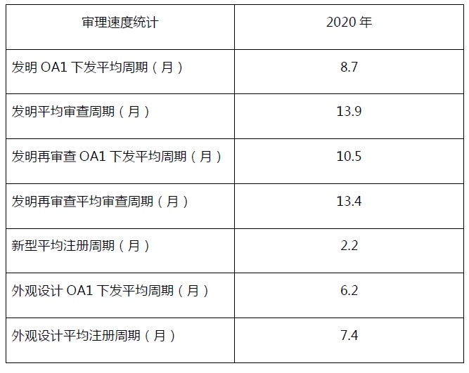 2020年中國臺灣智慧財產(chǎn)局審理速度統(tǒng)計,見下表: