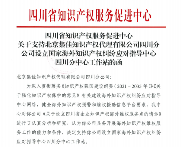 在授牌儀式上,楊波主任宣讀《四川省知識產權中心關于支持北京集佳知識產權代理有限公司四川分公司設立海外分中心工作站的函》,趙輝書記為集佳四川分公司進行授牌并合影留念。