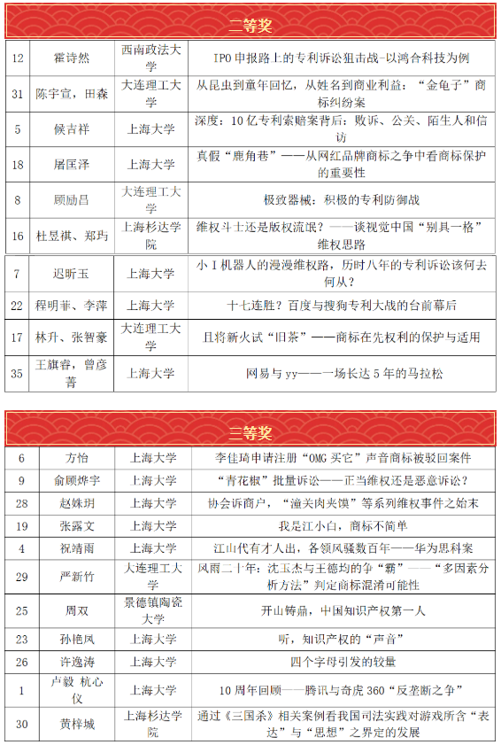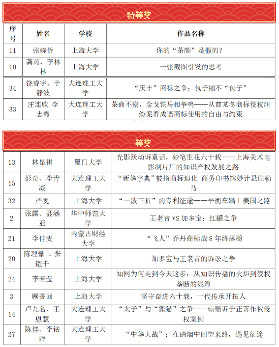 由集佳律所上海分所贊助、上海大學法學院/知識產權學院主辦的首屆“知識產權?中國故事”撰寫比賽,經過參賽作品展示、入圍初選、專家評審以及決賽答辯等環(huán)節(jié)的激烈角逐,于2022年3月26日在上海大學圓滿落下帷幕,來自上海大學、大連理工大學、西南政法大學、上海杉達學院、廈門大學、內蒙古財經大學、景德鎮(zhèn)陶瓷大學和華中師范大學的35組本科生及研究生摘奪了35個專業(yè)獎項。