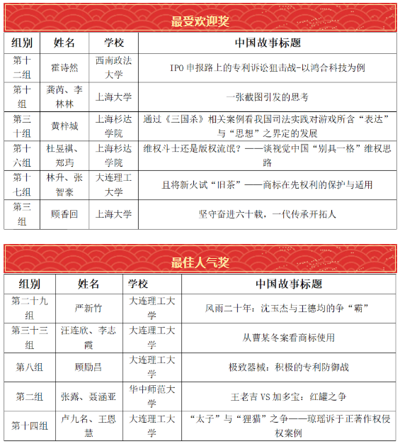 接下來就是最讓人激動的的頒獎環(huán)節(jié)了,頒獎嘉賓徐上、李文紅、袁真富、于偉、王勉青老師分別為獲得特等獎、一等獎、二等獎、三等獎,以及最受歡迎獎、最佳人氣獎的同學頒獎。研究生獲獎代表張婉僑同學和本科生獲獎代表汪連欣同學發(fā)表獲獎感言,感謝集佳上海分所提供支持,感謝本次比賽提供寶貴的學習機會,并祝愿比賽越辦越好。