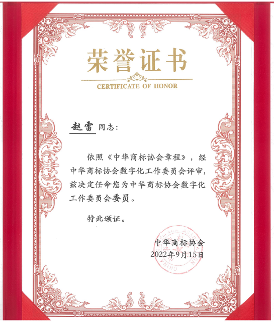 在本次論壇上,中華商標協會數字化工作委員會正式成立,并舉行揭牌儀式。《知識產權強國建設綱要(2021-2035年)》、《“十四五”國家知識產權保護和運用規劃》及《知識產權公共服務“十四五”規劃》等文件強調指出,要建立市場化、社會化的信息加工和服務機制,推動知識產權信息公共服務和市場化服務協調發展;要加強知識產權信息化、智能化基礎設施建設,推動知識產權數字化服務普惠應用。同時,對于企業和商標代理機構而言,如何在數字化時代進行高效的管理和溝通,做好品牌管理、預警和保護工作,一直都是市場主體的核心訴求。基于上述信息化和數字化的政策背景以及市場主體對數字化轉型的需求,中華商標協會成立“數字化工作委員會”,旨在促進行業數字化轉型升級,為貫徹上述《綱要》和《規劃》做出應有貢獻。會上,中華商標協會馬夫會長為首批數字化工作委員會的委員單位和委員頒發證書。集佳知識產權入選了首批數字化工作委員會委員單位,趙雷律師被任命為數字化工作委員會委員。