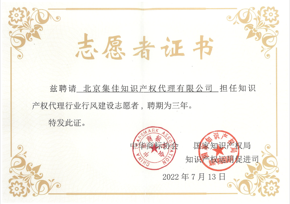 行風建設年活動由國家知識產權局知識產權運用促進司指導,中華全國專利代理師協會和中華商標協會聯合舉辦,是深入貫徹落實知識產權強國建設綱要和“十四五”知識產權保護和運用規劃的部署要求,著力推進知識產權代理服務業高質量發展的一項重要舉措。在本次活動中,集佳憑借優質、專業的知識產權代理服務,獲聘擔任知識產權代理行業行風建設志愿者。作為行風建設志愿者,集佳積極發揮表率作用,嚴格要求自己,在知識產權代理工作中堅守職業道德,恪守工作職責,持續引導行業健康發展。