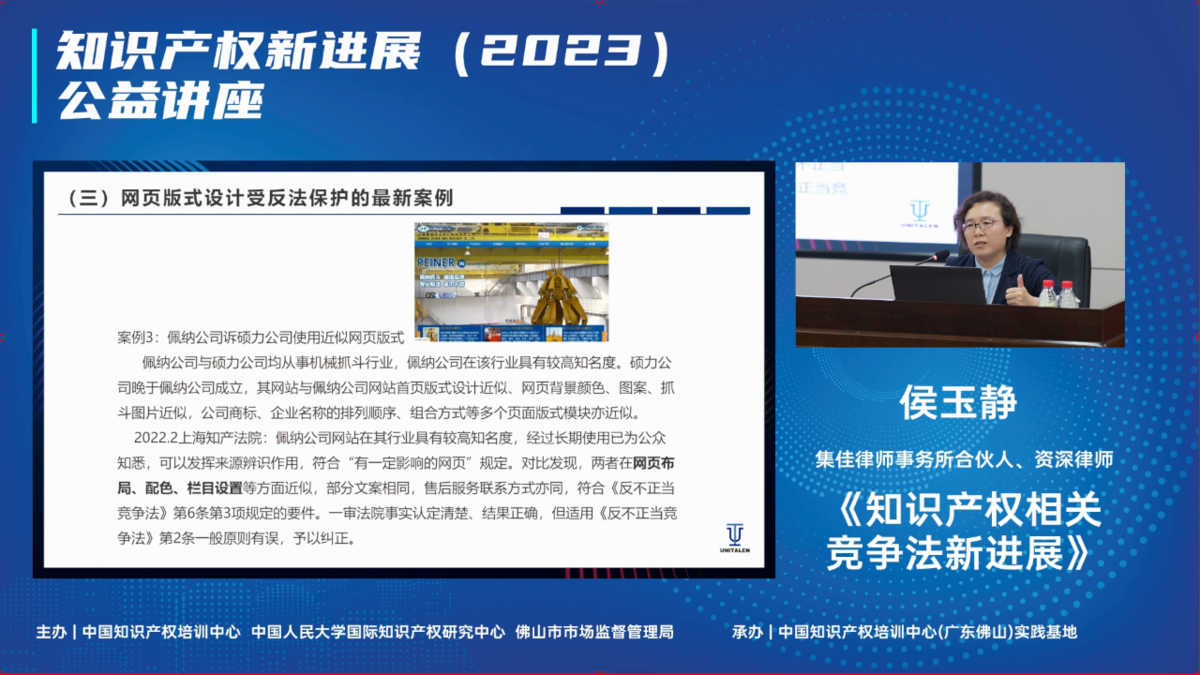 2023年9月7日,由中國知識產權培訓中心、中國人民大學國際知識產權研究中心、佛山市市場監督管理局聯合主辦的“知識產權新進(2023)公益講座”在中國知識產權培訓中心(廣東佛山)實踐基地舉行,集佳合伙人侯玉靜律師應邀參加公益講座并發表主題演講。