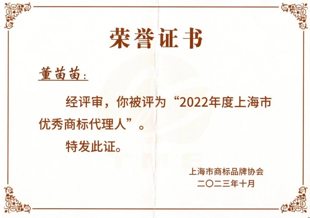 2024年1月10日,上海市商標品牌協會開會表彰了被評為2022年度“上海市優秀商標代理機構”“優秀商標代理人”以及“上海市優秀商標代理機構提名”“優秀商標代理人提名”的單位和個人。
