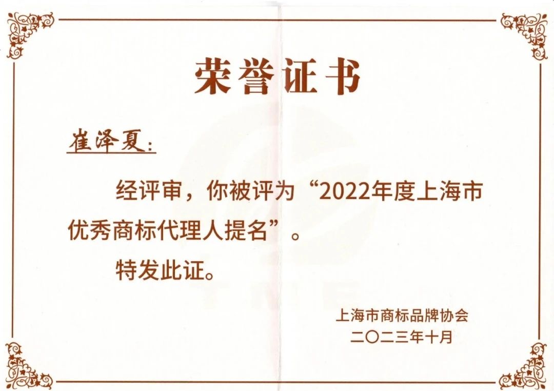 集佳上海分所崔澤夏律師獲得2022年度“上海市優秀商標代理人提名”