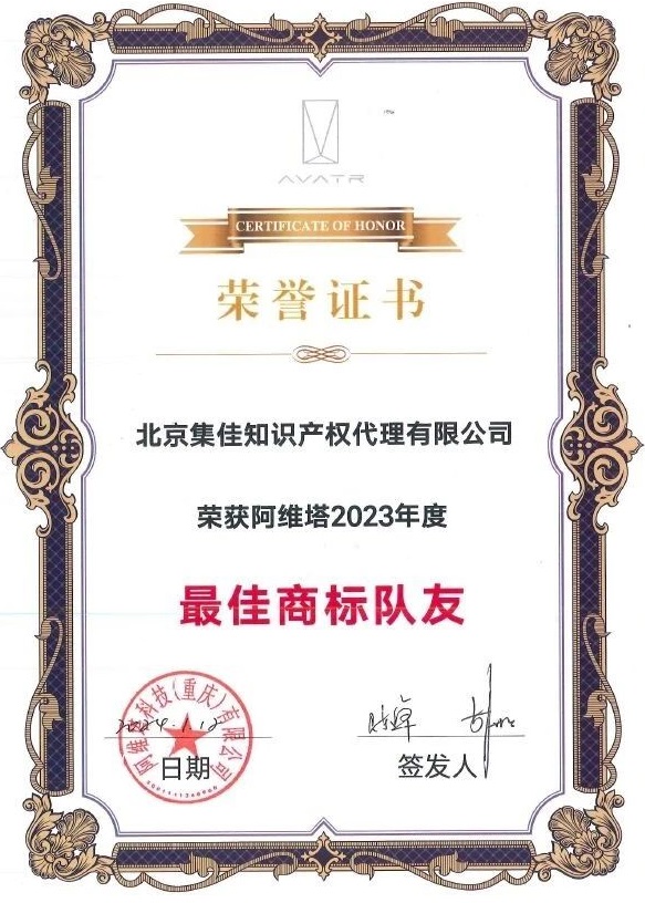 近日,集佳優質服務再次喜獲客戶點贊——阿維塔科技(重慶)有限公司(以下簡稱“阿維塔”)授予集佳2023年度“最佳商標隊友”榮譽稱號。