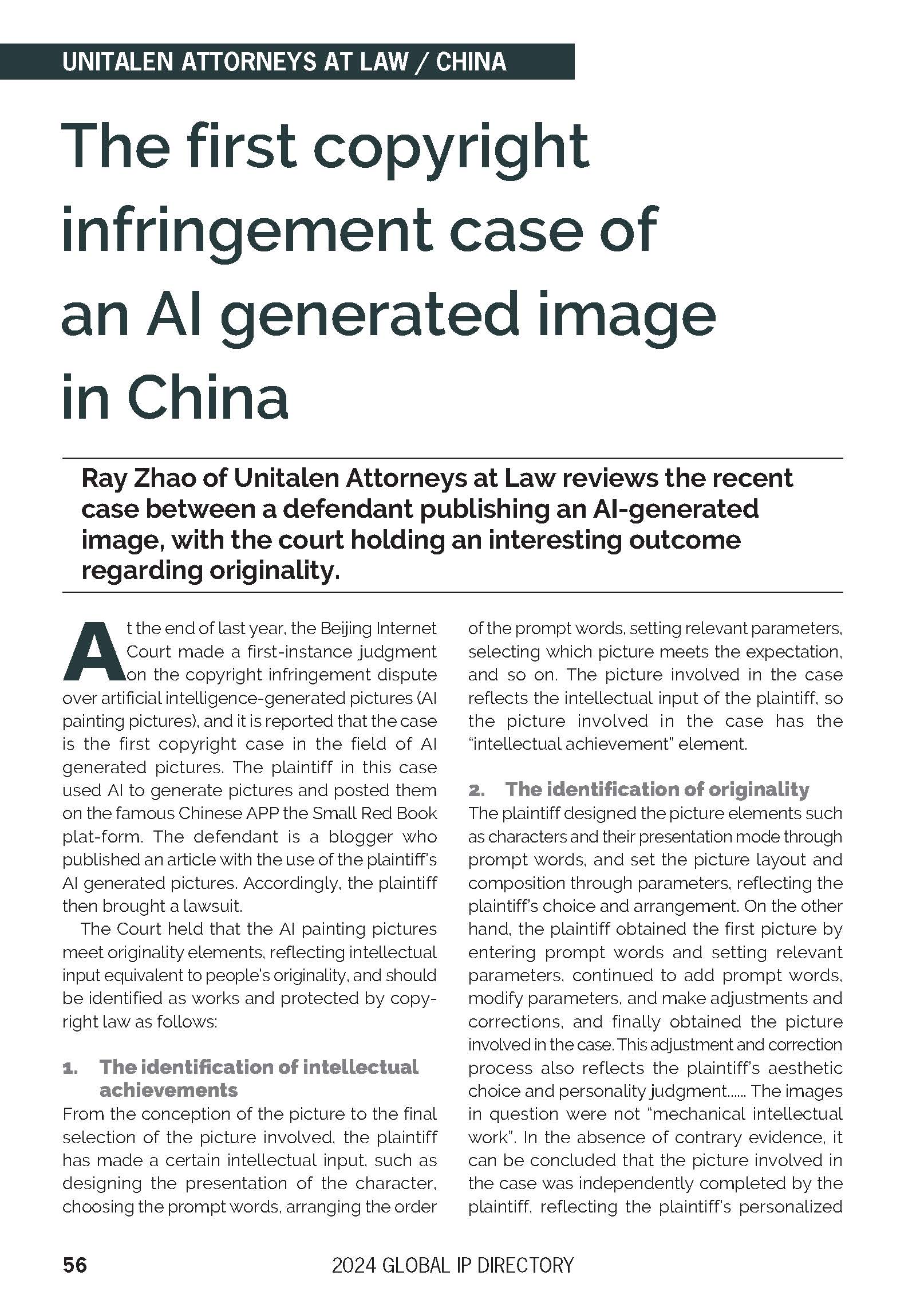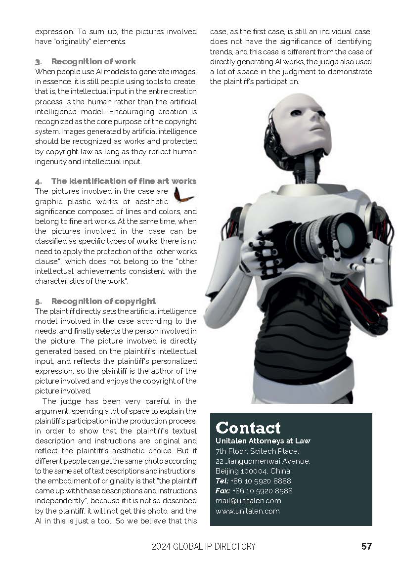 集佳文章《The first copyright infringement case of an AI generated image in China 》在《The Global IP Directory 2024》發表