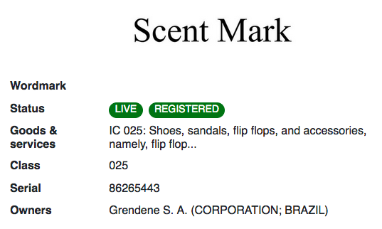 鞋類連鎖店 Flip Flop Shops 在線下店鋪中使用的椰子香味已獲得商標注冊。注冊人申請時提交了大量新聞報道,聲稱這種香味是他們品牌的重要識別部分。其中一個例子寫道,“從 15 英尺外走近,椰子防曬油的香味和充滿能量的音樂開始刺激感官,讓潛在顧客興奮不已。”