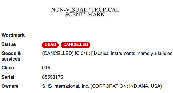 該公司將一種尤克里里琴型號所用的椰林飄香氣味成功申請為商標。但在實際使用過程中卻面臨產品本身的問題。運往海外的尤克里里琴在運輸過程中失去了氣味……所以當海外客戶彈奏時,它們聞起來就只是尤克里里琴的味道了。目前該商標注冊已失效。