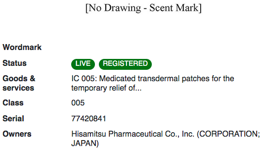 日本久光制藥株式會社為其止痛貼的“薄荷”香味注冊了商標,這種氣味是由“高濃度水楊酸甲酯(10wt%)和薄荷醇(3wt%)混合而成”的。